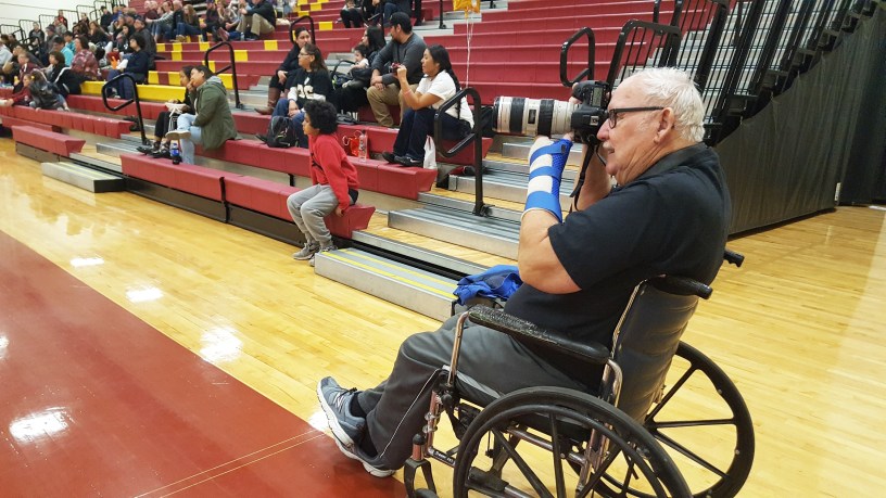 Diane Hausske is battling cancer and Jim Hausske has had to undergo a series of surgeries on his arms, legs and hips. That’s why you’ll often see him sitting in a wheelchair courtside while he’s taking photos.