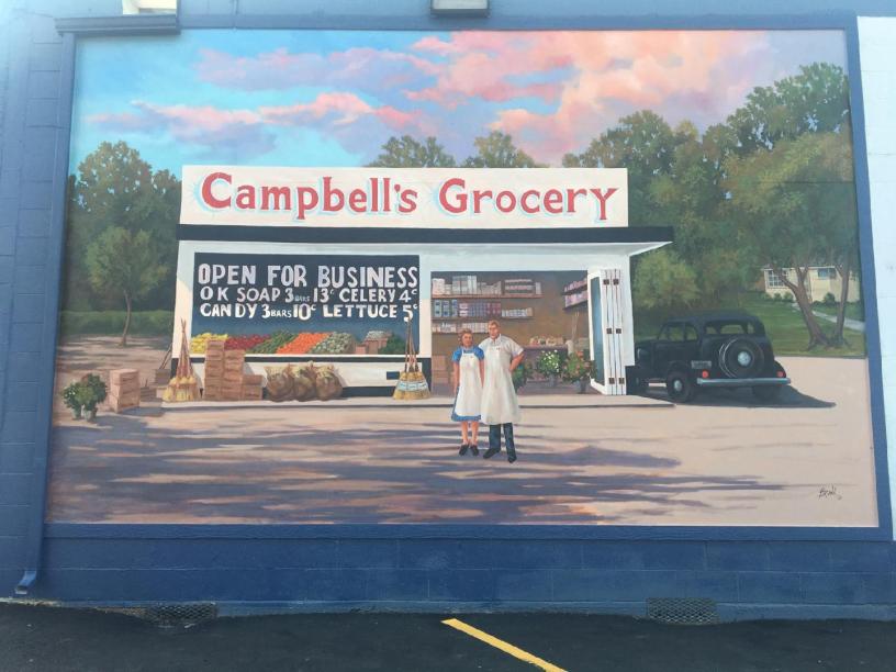 The new mural also features fresh produce, some dry goods and an old Ford that was “always parked outside” in the 1930s and ‘40s. The image also shows Mr. and Mrs. Campbell standing in front of the store, wearing their work aprons.